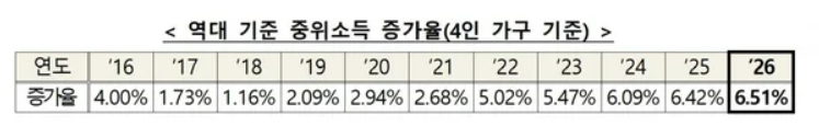 2026년에는 4인 가구 기준으로 기준 중위소득이 약 6.51% 인상되어 약 649만 4,738원으로 결정되었습니다. 1인 가구 기준은 약 7.20% 인상된 약 256만 4,238원입니다. 2025년에도 기준 중위소득이 인상된 바 있습니다. - 급여별 선정기준 비율은 동일 유지