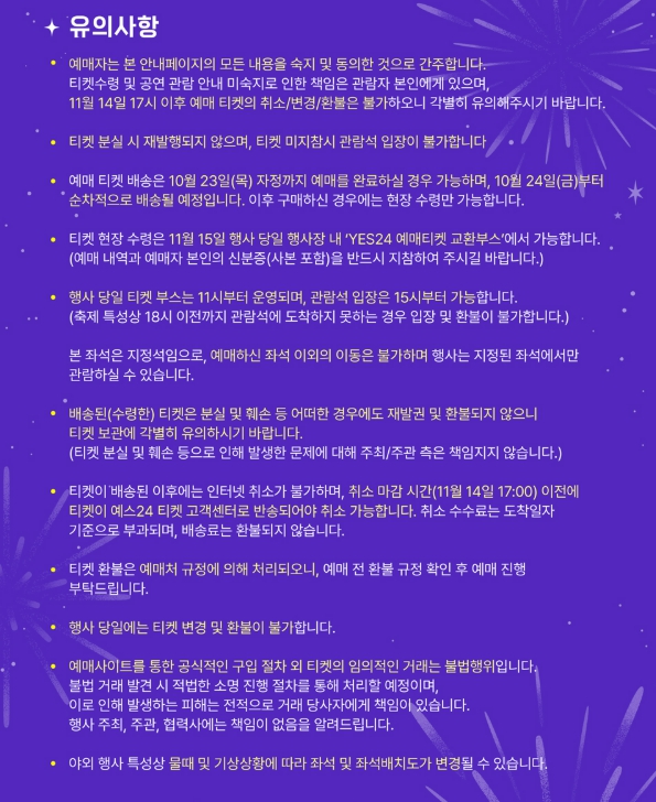 - 의자 구역 입장은 오후 15시부터이며, 당일 수령 불가 시 환불이 불가한 경우도 있습니다. 이처럼 좌석 위치·타이밍·예매 준비가 관람 만족도를 크게 좌우하므로, ‘명당 자리 확보’라는 목표로 사전에 치밀히 준비하는 것이 좋습니다.