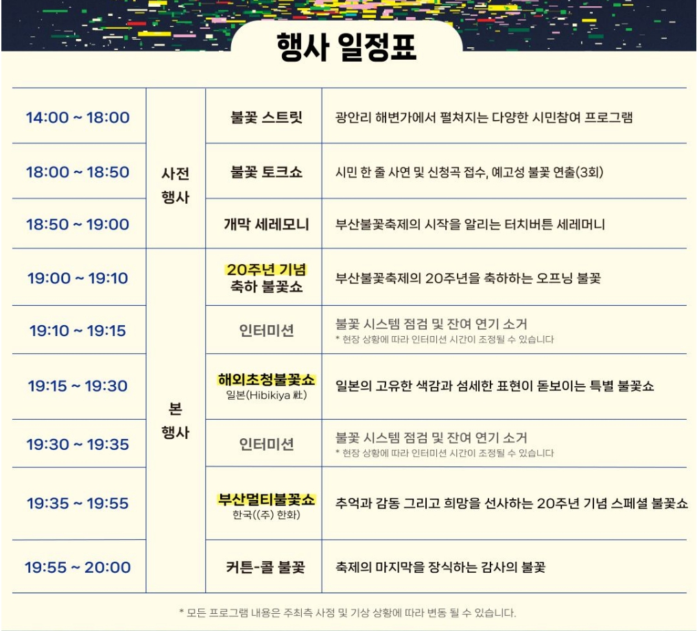 시간은 저녁 19시경부터 시작될 예정이며 관람시간은 약 60분가량입니다. 축제 주최는 부산광역시이며 주관은 부산축제조직위원회입니다. 바다와 다리(광안대교)의 조명이 어우러진 장관과 더불어, 올해는 멀티스팟 연출과 고도화된 불꽃쇼가 더해져 “빛으로 물든 부산의 밤”을 주제로 삼고 있습니다. 따라서 친구, 연인, 가족 누구와 함께 가도 기억에 남을 장면을 만날 수 있는 기회입니다.