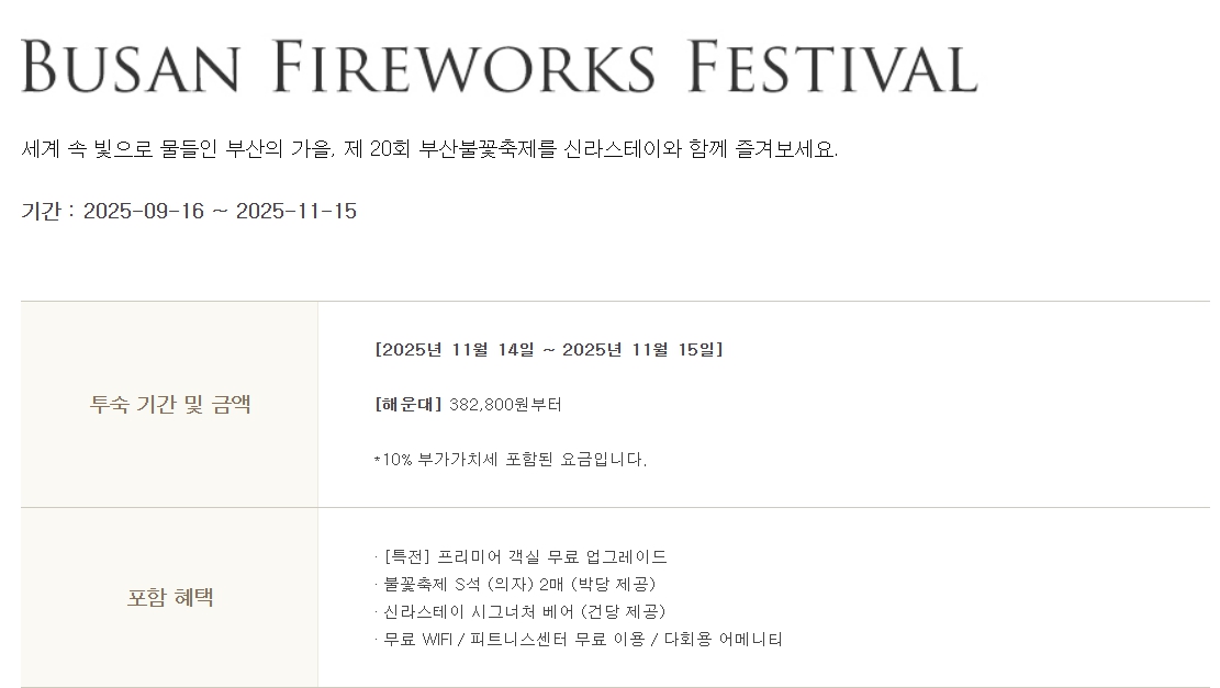 부산불꽃축제를 제대로 즐기고자 한다면 숙박과 관람 좌석이 결합된 패키지도 좋은 선택입니다. 신라스테이 해운대에서 마련한 ‘불꽃축제 패키지’는 아래와 같은 혜택을 담고 있습니다.