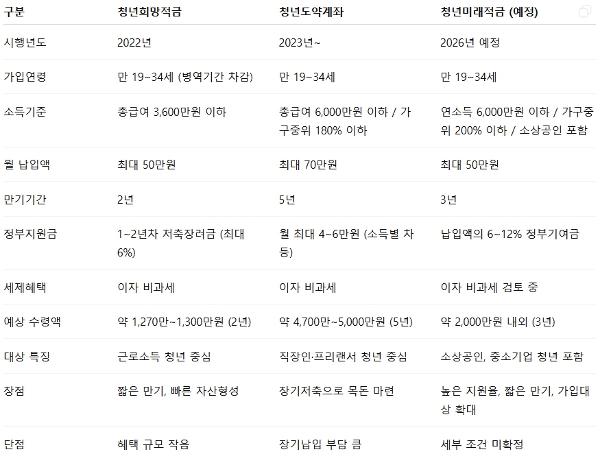 청년 희망적금 vs 청년도약계좌 vs 청년 미래적금(예정) 비교표
