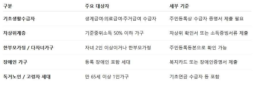 💡 단독가구(1인)도 위 조건을 충족하면 신청 가능하며, 세대원 중 1명이라도 자격요건에 해당되면 전체 세대가 지원대상으로 인정됩니다.