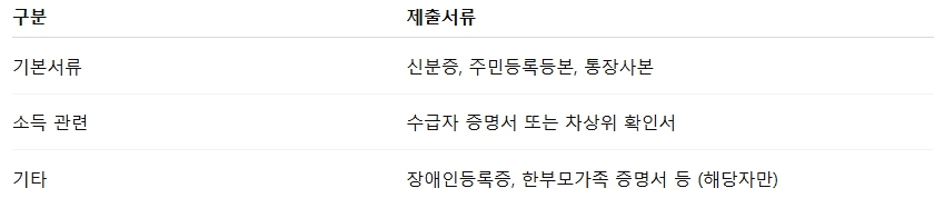 - 신분증, 통장사본, 수급자 증명서 등 제출