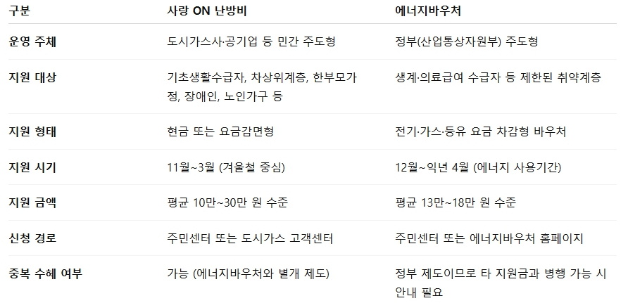 ‘사랑 ON 난방비’ vs ‘에너지바우처’ 비교표