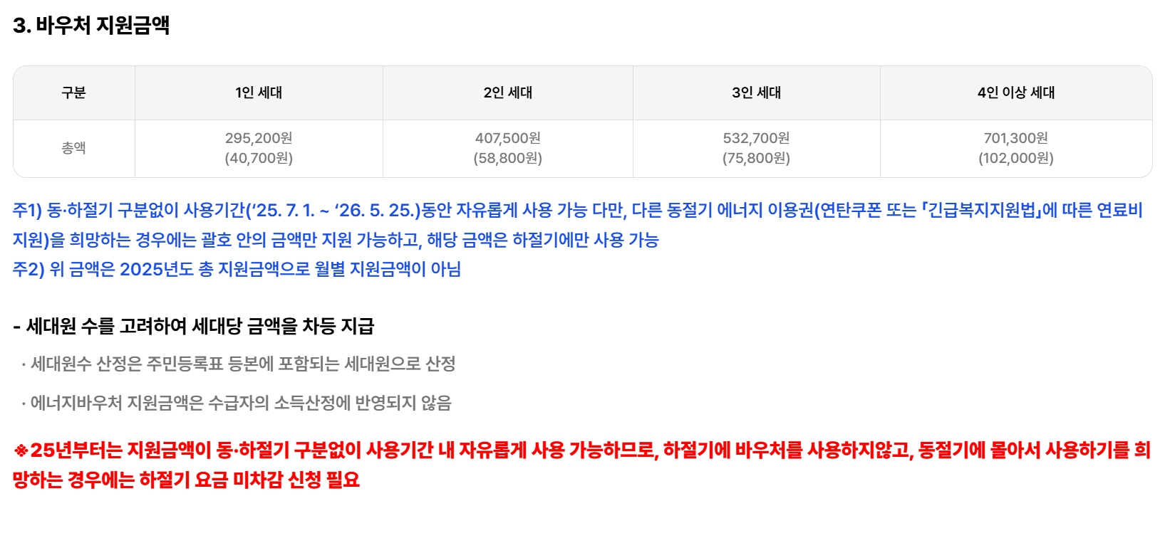 ※ 위 금액은 겨울철 ‘동절기 바우처’ 기준이며, 여름철 냉방 지원분은 별도로 포함되지 않습니다.