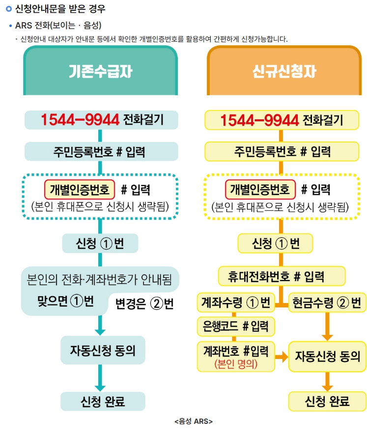 - 안내대상자(안내문 받은 자)는 ARS 전화(예: 1544-9944) → 주민등록번호 입력 → 개별인증번호 입력 → 신청 완료.