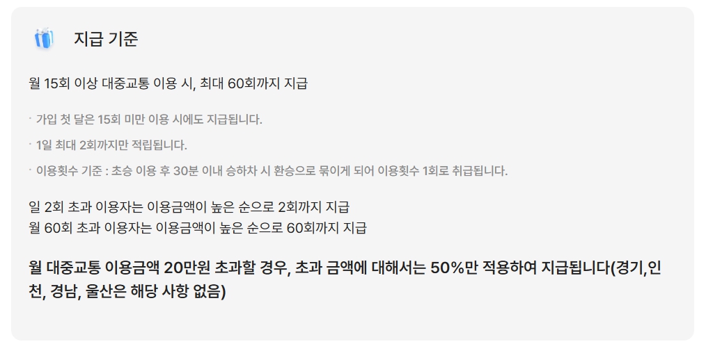 - ‘월 15회 이상 대중교통 이용’이 기본 충족 조건 중 하나입니다.