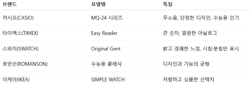 앞서 언급한 수능용 아날로그 시계는 수험생 필수템입니다. 기능보다 조용하고 단정한 디자인을 선택하는 것이 좋습니다.