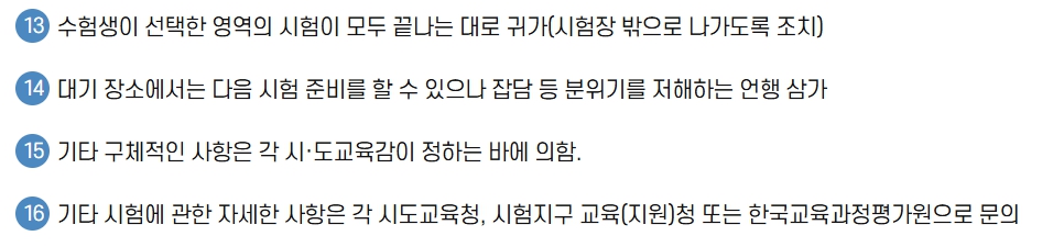 - 수능 중 화장실은 교시별 쉬는 시간에만 가능하므로, 시간 분배에 유의해야 합니다.