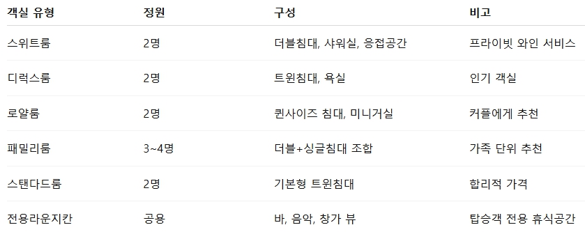 - 출발 전 ‘탑승요령’, ‘집결지 및 시간’, 객실 옵션 등을 반드시 숙지해두세요. 예약확인 문자 등이 별도로 발송됩니다.