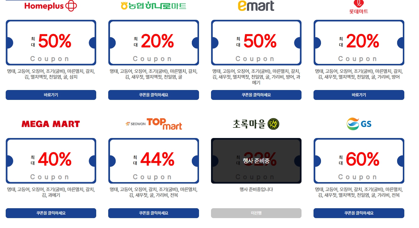 - 오프라인 대형마트나 수산시장, 전통시장 등에서 행사 상품 전시가 진행될 가능성이 높습니다. 직접 방문 시 할인 표시나 배너를 확인하는 것이 좋습니다.