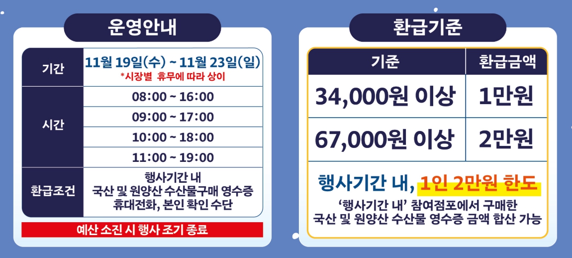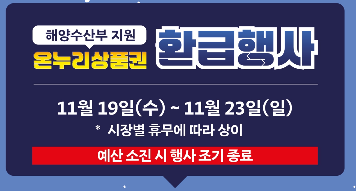- 혜택: 국산 수산물 구매금액의 최대 30%를 온누리상품권으로 환급