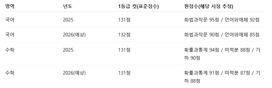 ※ 원점수 기준은 제공된 일부 정보에 따라 정리된 것으로, 선택 과목 조합이나 응시자 분포에 따라 변동 폭이 존재합니다.