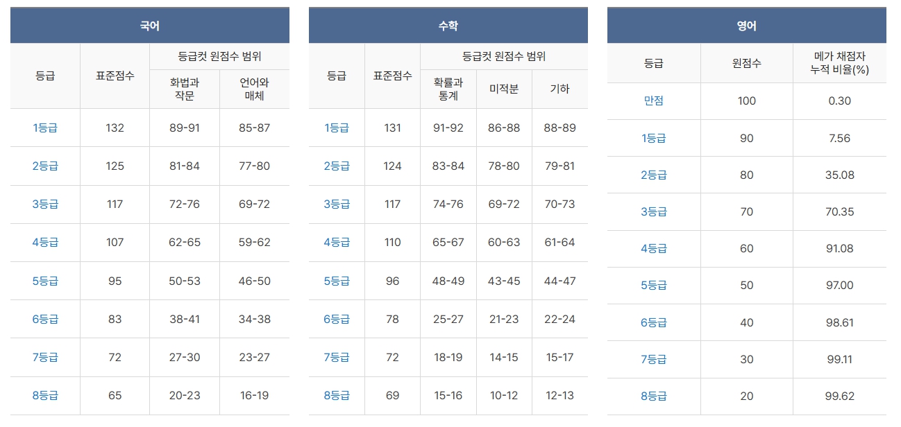 표준점수: 1등급 기준 국어 131점, 2등급 125점, 3등급 117점 등이었습니다.