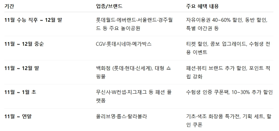 수능이 끝나는 순간부터 전국 곳곳에서는 수험생들을 위한 다양한 프로모션이 본격적으로 시작됩니다. 수험표 한 장만으로도 놀이공원부터 패션·뷰티 브랜드, 전자기기, 통신사, 외식·패밀리레스토랑까지 폭넓은 혜택을 누릴 수 있는 시기이기 때문에, 이를 잘 정리해두면 훨씬 효율적으로 활용할 수 있습니다. 아래는 2025년 11월부터 2026년 초까지 이어지는 주요 수험생 프로모션 기간을 캘린더 형식으로 정리한 내용입니다.