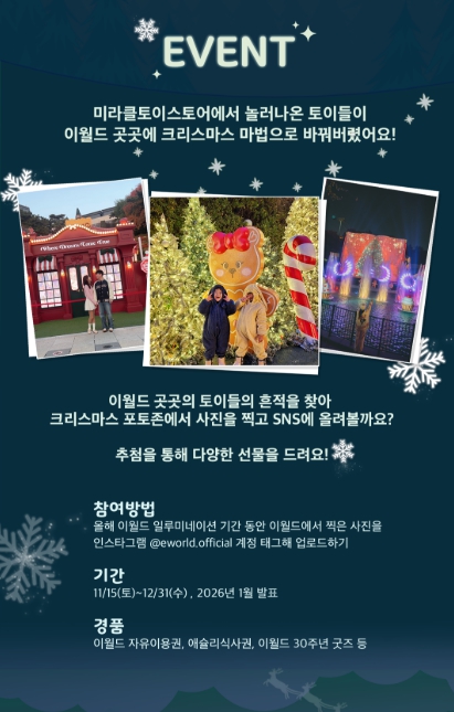 한국관광공사 선정 야경 100선. 이월드는 겨울이 되면 전국 최대급 조명 규모를 선보이며 SNS에서 항상 화제가 되었습니다. 행사기간은 25년 11월 15일부터 26년 2월 28일까지 운영됩니다. 점등식은 11월 15일 19:50분이며, 불꽃축제는 20:00에 진행됩니다.