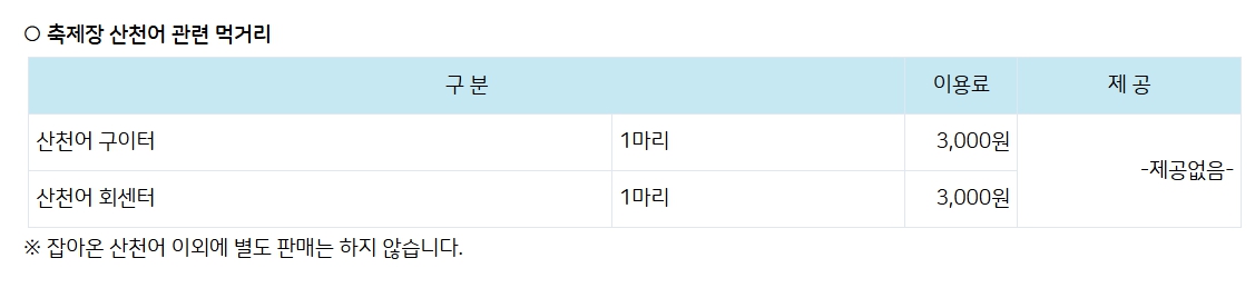 - 지역 먹거리(숯불 산천어 구이)가 특히 유명했습니다.