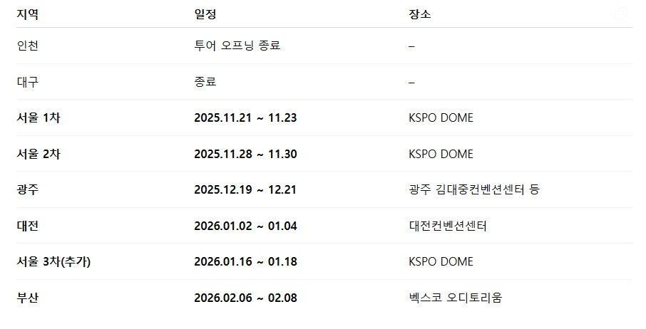 위 일정은 공연 기획사 및 공식 채널의 공지에 따라 순차적으로 업데이트되었으며, 추가 지역 또는 연장 공연이 생길 가능성도 열려 있는 상태입니다.