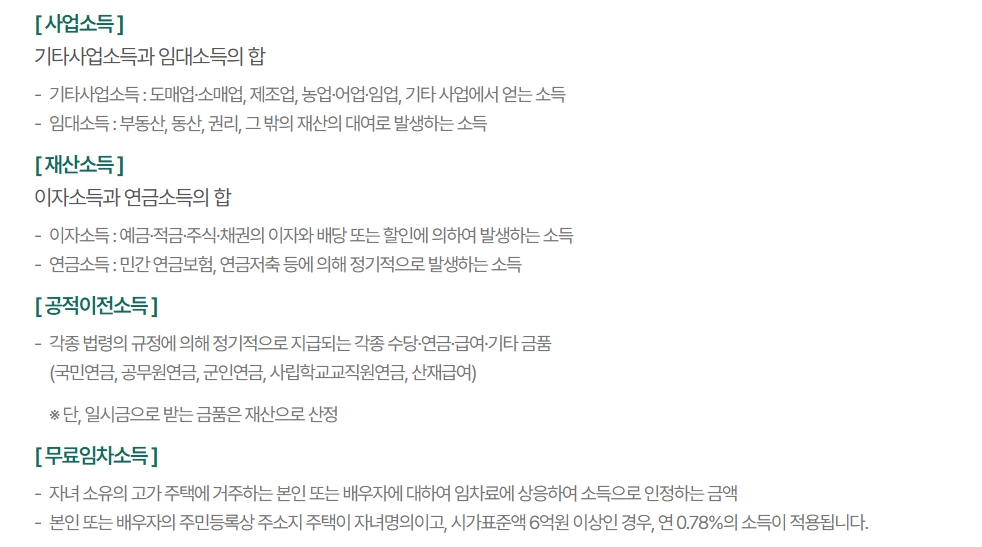 - 근로소득, 사업소득, 공적연금, 금융소득 등 포함