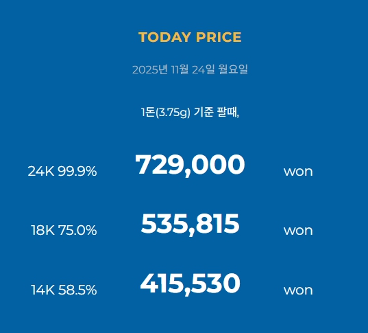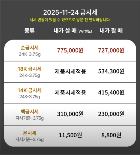 **오늘의 금시세 11월 24일 기준 725,250원 입니다. 포탈사이트에서 제가 직접 서칭해 매입 가격이 조금 더 잘나오는 곳으로 안내해드렸습니다. 단, 시세는 매일 달라지고 업체들마다 산정하는 수수료가 다르기때문에 금 매입을 하시려면 현재 거주하고 계시는 집 거주지 주변으로 여러 곳을 비교해보시길 권고드립니다.