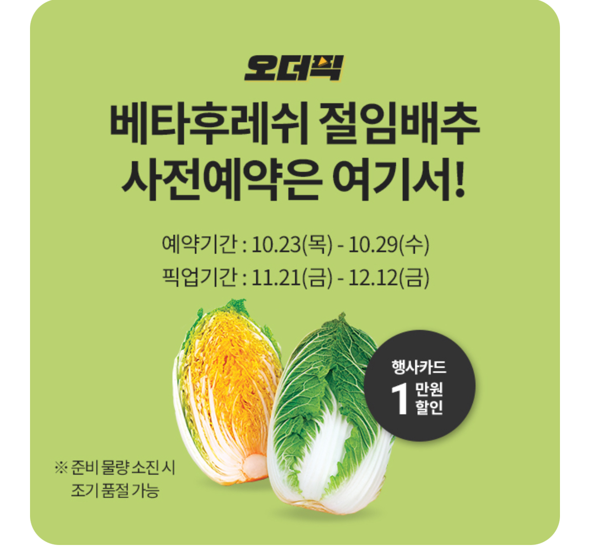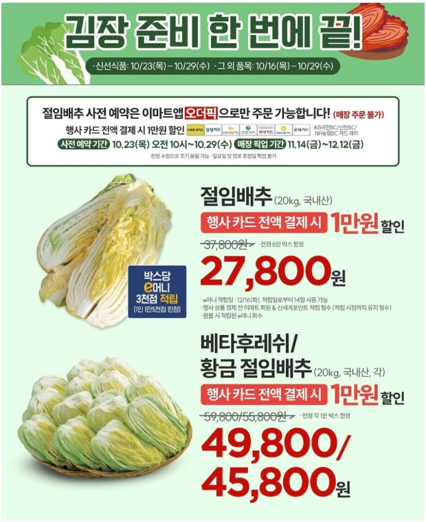 - 이마트는 김장철을 앞두고 10월 23일(목)부터 10월 29일(수)까지 일주일간 절임배추 사전예약 행사를 진행합니다.