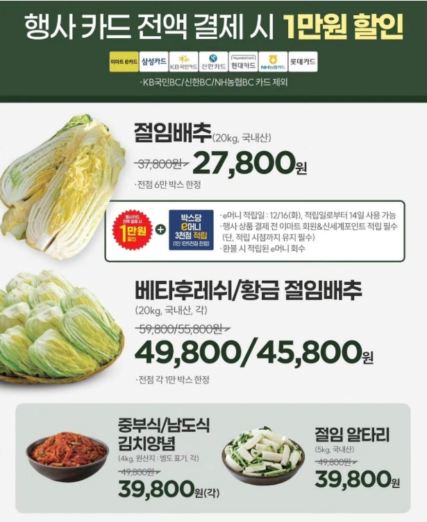 - 품목 다양화도 눈에 띄는데, 예컨대 ‘베타후레쉬 절임배추(20 kg/박스)’는 행사카드 이용 시 약 49,800원, ‘황금 절임배추(20 kg/박스)’는 약 45,800원 수준으로 준비되었습니다.
