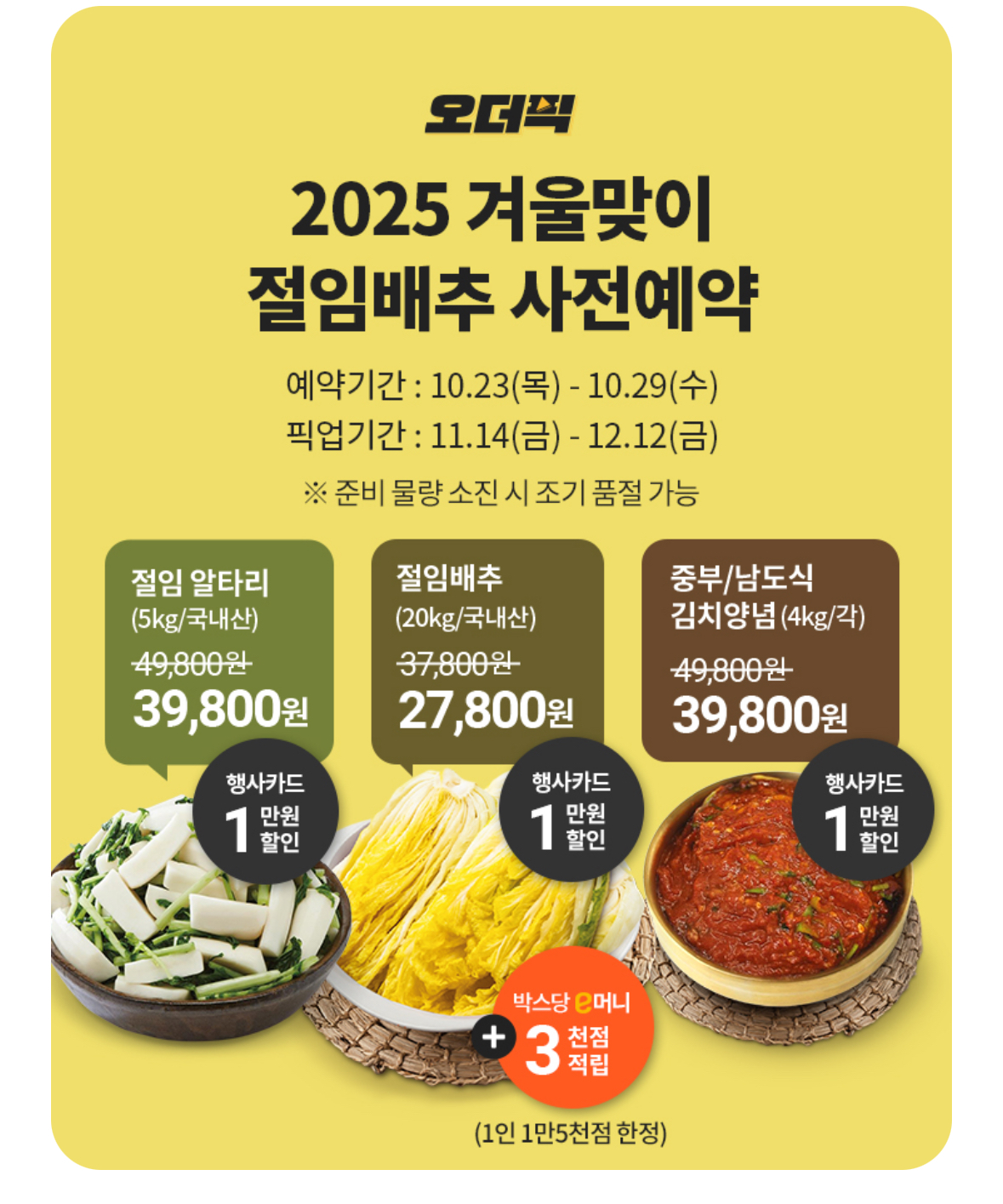 - 또한, 절임배추 외에도 ‘절임 알타리(5 kg/박스)’가 행사카드 이용 시 약 39,900원으로 기획된 바 있습니다.