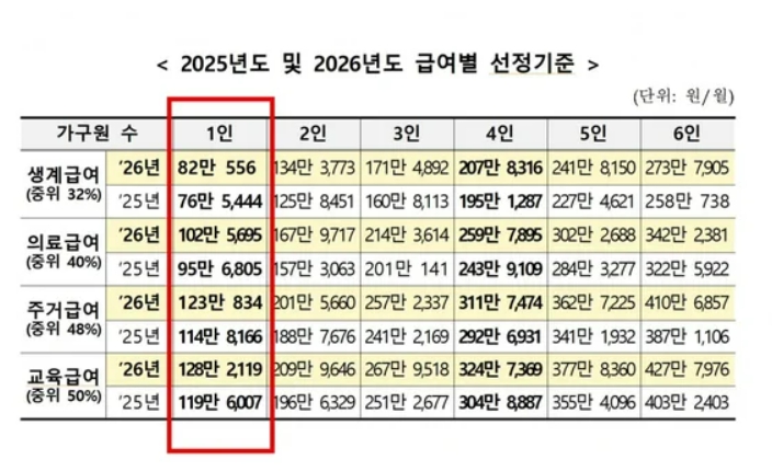 - 선정 기준: 기준 중위소득의 48% 이하(2025~2026년 동일)입니다. 예컨대 2026년 1인 가구 기준 약 123만 834원 이하 등이 선정기준으로 제시되었습니다.