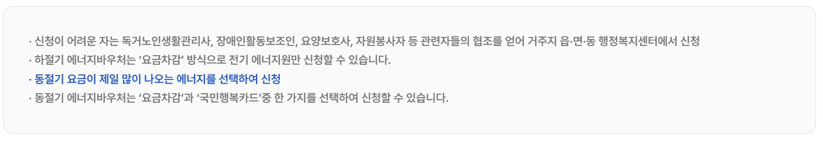- 일부 지역은 전화나 온라인 신청으로도 가능하며, 이미 에너지복지 대상자인 경우 자동 감면 처리되는 경우도 있습니다.