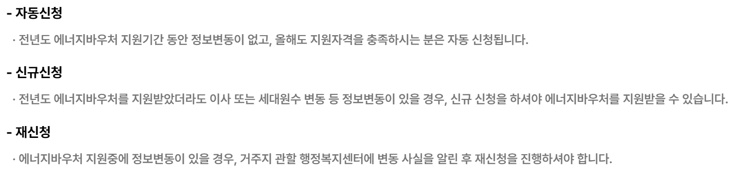 - 일부 기업은 에너지바우처 수급자 외의 차상위계층까지 포함해 별도로 20만 원 상당의 현금형 지원을 제공합니다.