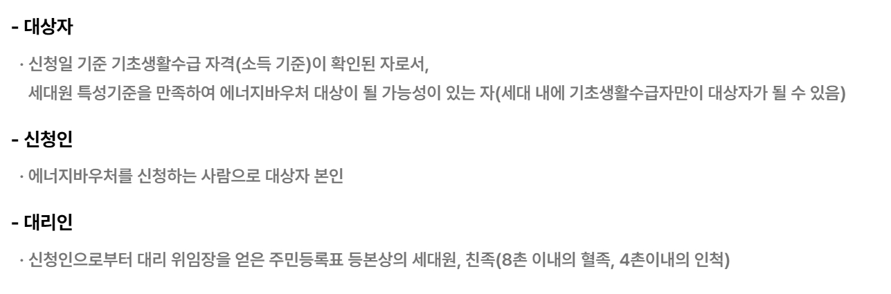 에너지바우처는 기초생활수급자 및 차상위계층 중에서 아래 한 가지 이상의 조건을 충족하는 세대가 신청할 수 있습니다.